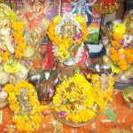 She placed the silver Mangala Gauri that was given to her during her marriage with a small idol of Annapurna and Ganesha and Gauri made out of turmeric paste in the worship area. Since Mom is ill, she couldn’t clear sufficient space for it. Though it is congested, she managed to perform Shodashopachara to it.
